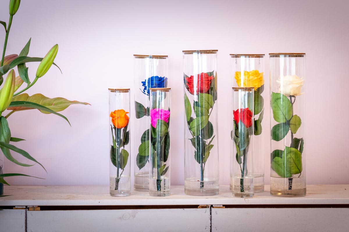 Sono vere e proprie rose, raccolte al momento della massima fioritura e trattate con una soluzione a base di glicerina naturale. Il risultato? Un fiore che mantiene la morbidezza e la forma originale, colori brillanti e realistici con una durata dai 3 ai 5 anni. Non hanno nessuna esigenza di acqua o luce solare diretta.
